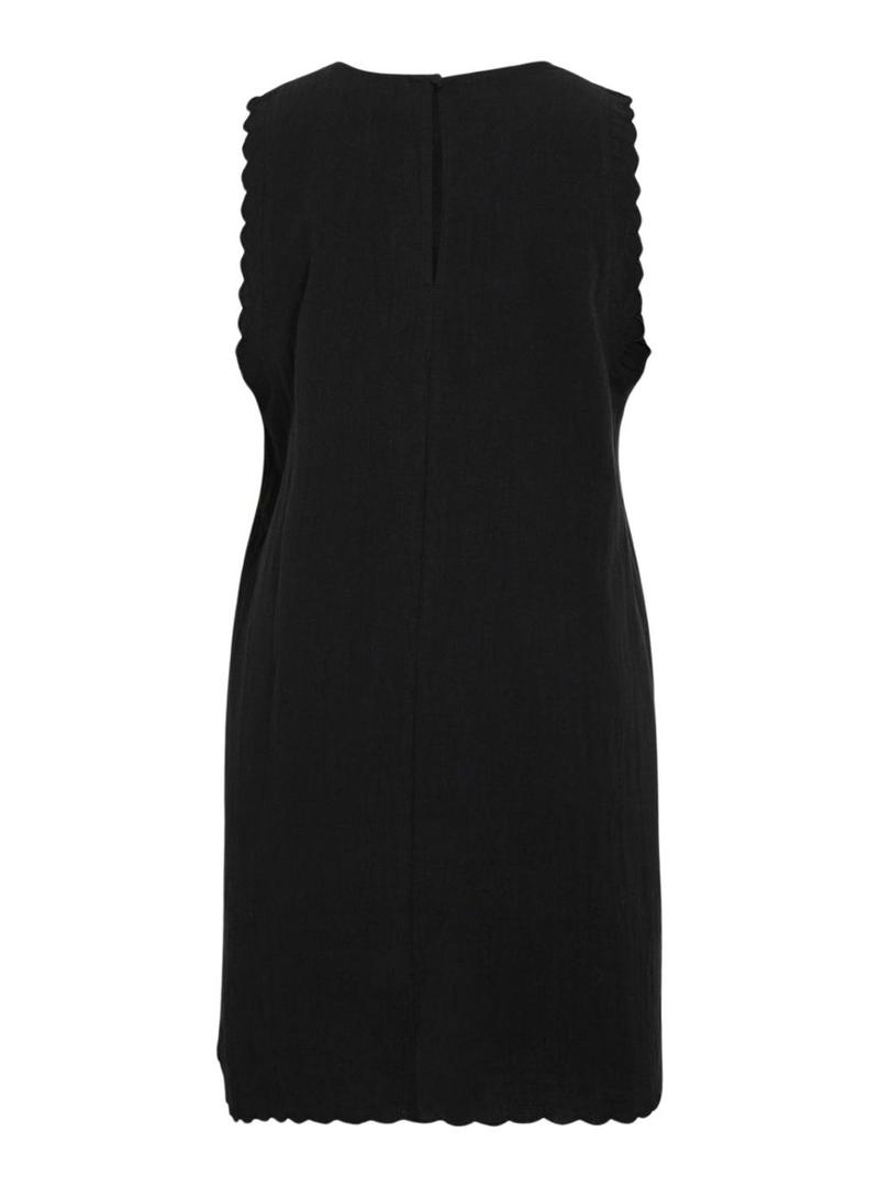 Vestido Vila. Modelo Vifernanda. Cor preta. Gola redonda. Sem mangas. Extremidades com acabamento ondulado. Corte em linha A. Comprimento mini.