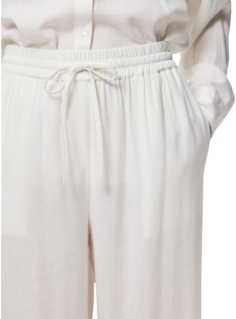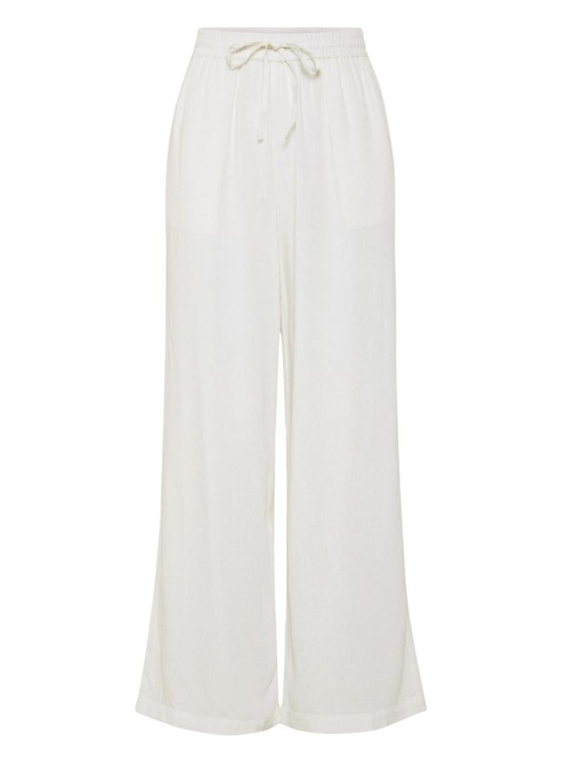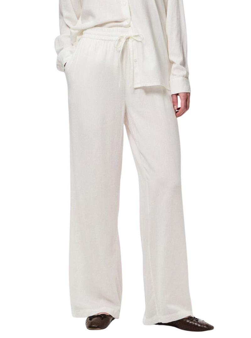 Calça Pieces. Modelo Pia Wide. Cor branca. Corte largo. Bolsos laterais. Tecido fluido e leve com linho. Cintura elástica com cordão ajustável. Estilo básico.