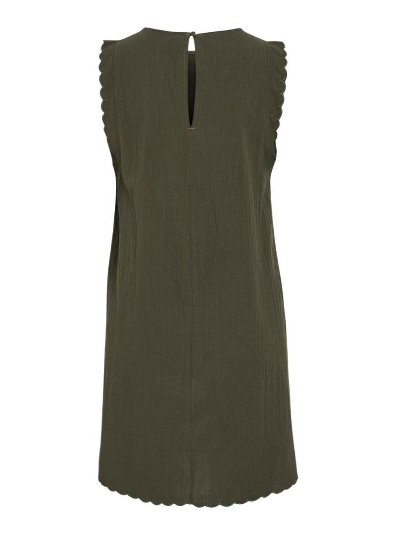 Vestido Vila. Modelo Vifernanda. Cor verde. Gola redonda. Sem mangas. Extremidades com acabamento em ondas. Corte em linha A. Comprimento mini. Fechamento traseiro com botão e decote lágrima.