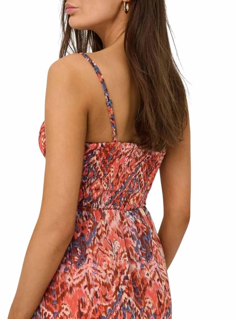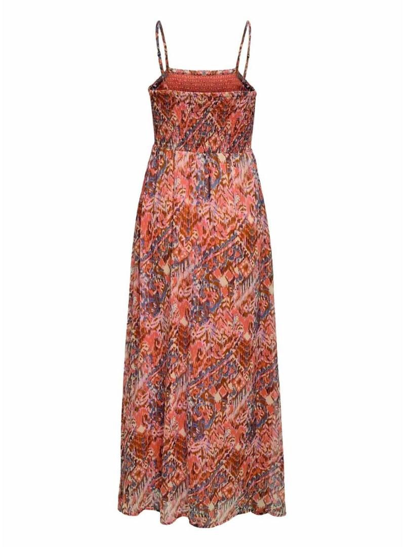 Vestido Only. Modelo Elena. Estampa étnica. Cor coral. Decote reto. Alças finas. Costas com peça elástica. Tecido de gaze. Forro interno. Comprimento até os tornozelos.