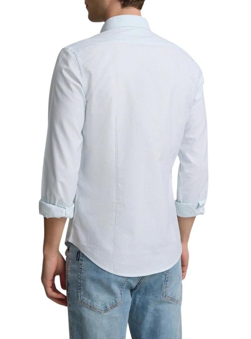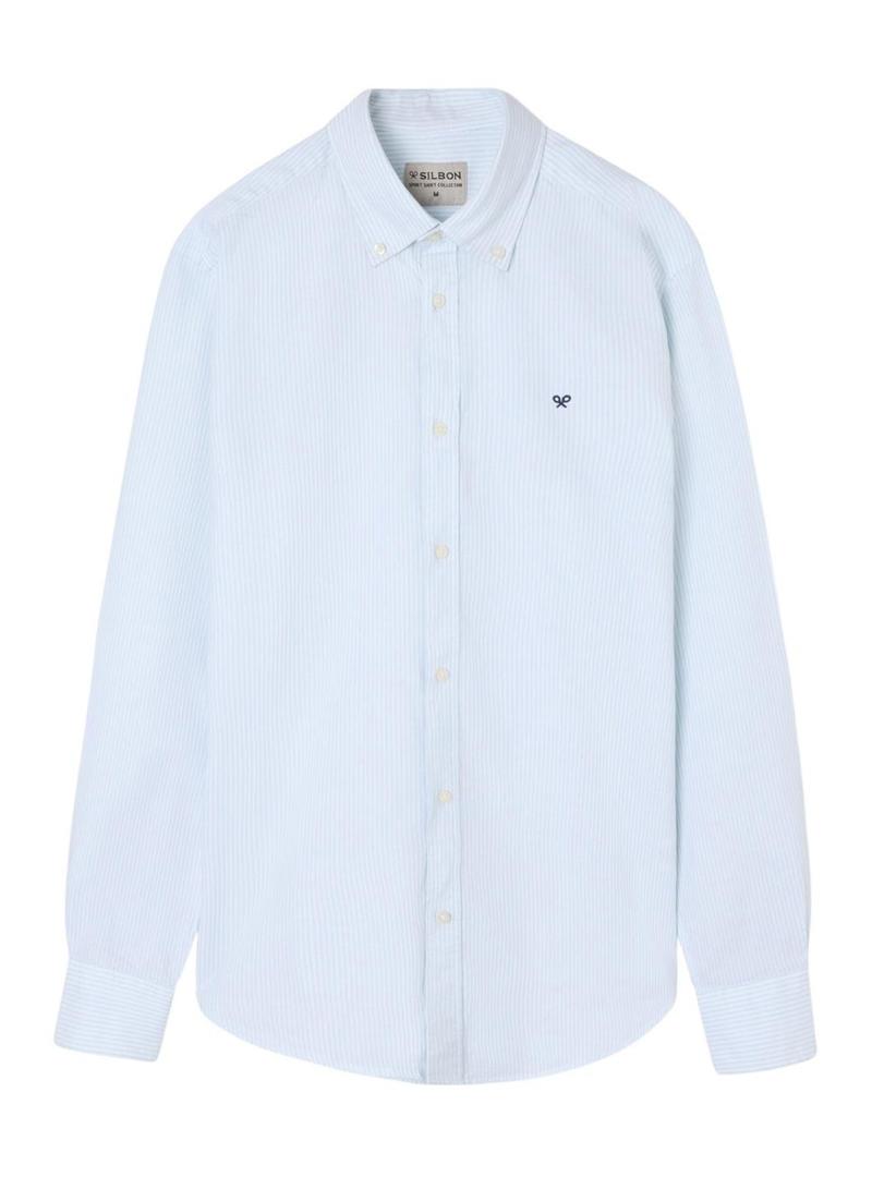 Camisa Silbon. Modelo Sport Oxford. Cor verde e branco. Estampa listrada. Gola com botões. Logo bordado em contraste. Barra arredondada. Ajuste regular. Fechamento com botões perolados.