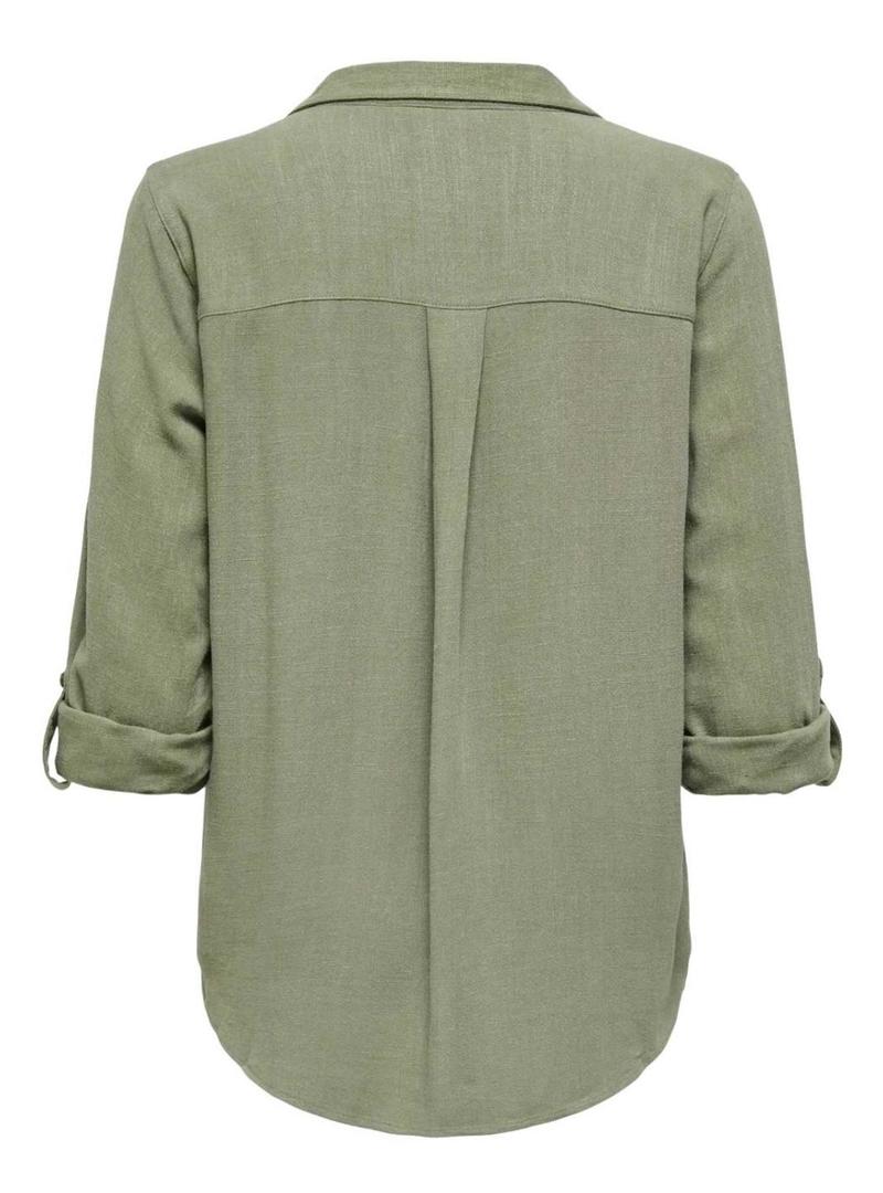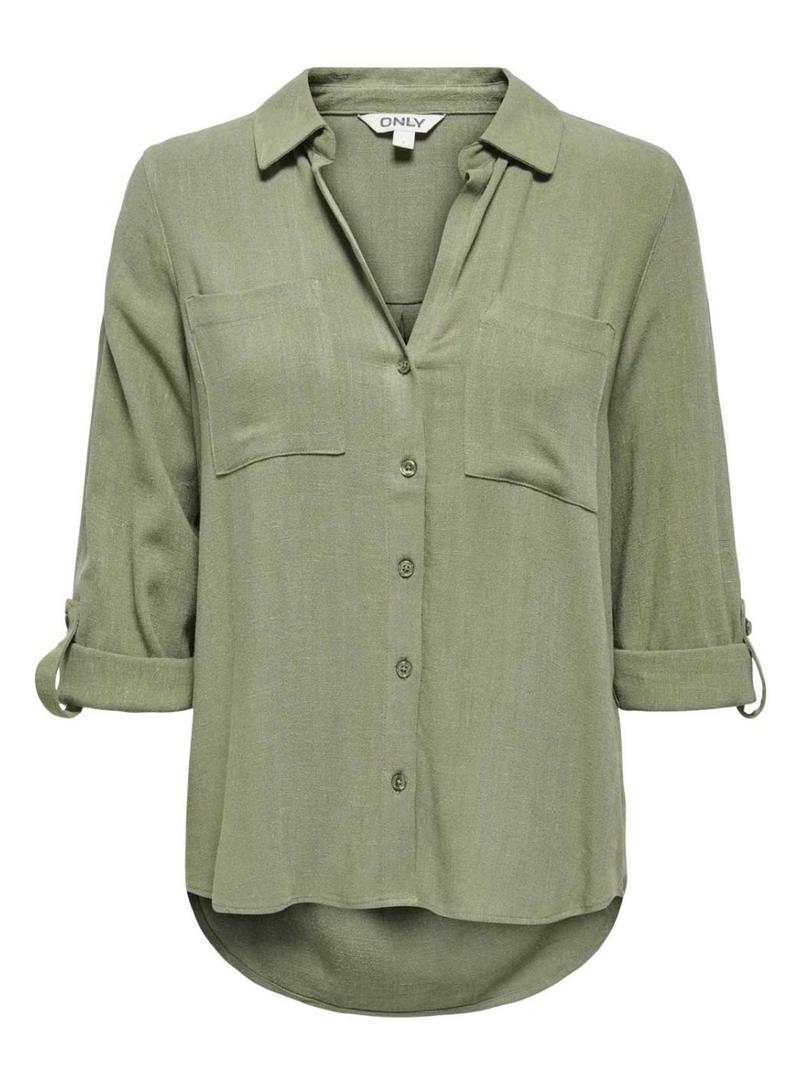 Camisa Only. Modelo Yasmin. Cor verde. Decote em V. Fecho com botões. Ajuste fluído. Bolsos de remendo no peito. Parte de trás mais comprida que a da frente. Mangas com fita para ajustar o comprimento.