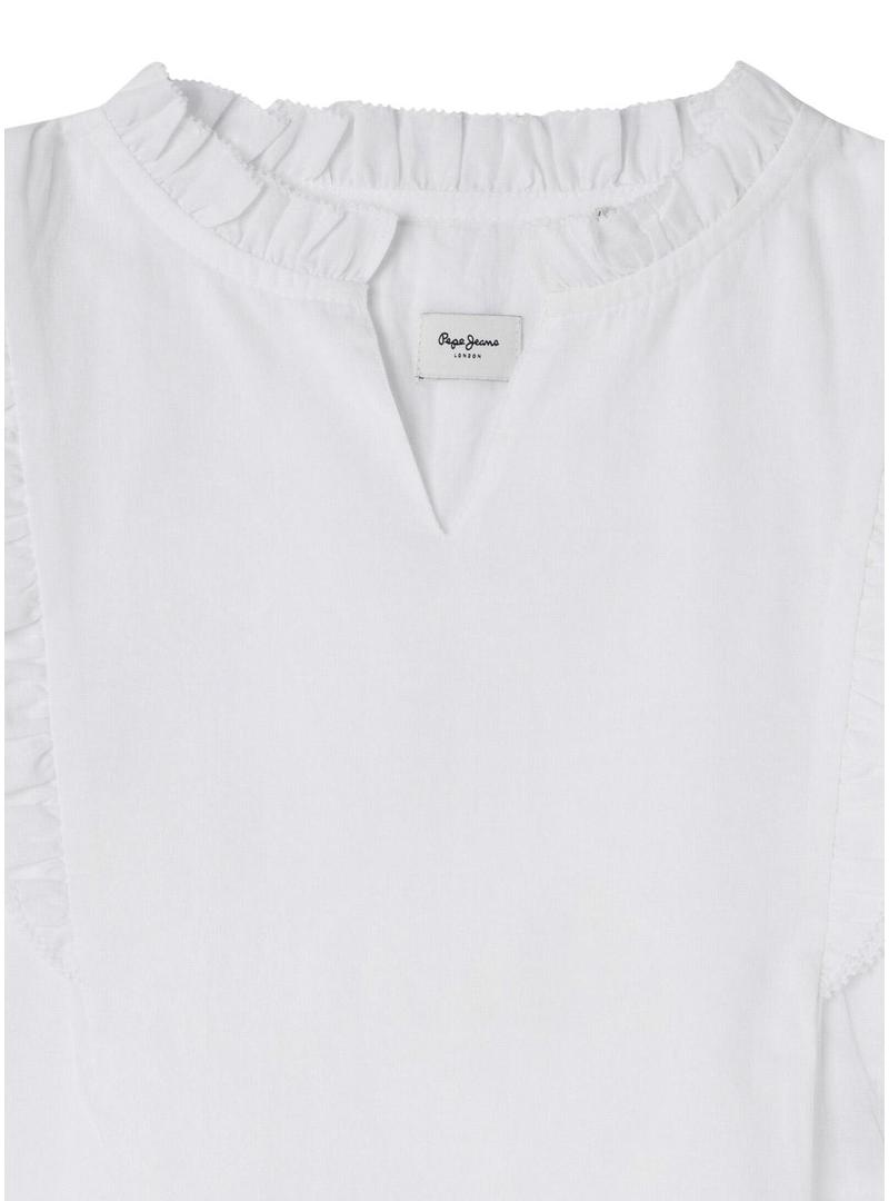 Blusa Pepe Jeans. Modelo Monica. Cor branca. Gola redonda com babados. Decote em V. Manga borboleta. Corte quadrado. Babados nas mangas. Placa metálica com logo na parte inferior.