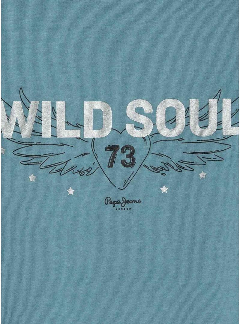 Camiseta Pepe Jeans. Modelo Thais. Cor azul turquesa. Gola redonda. Manga curta. Ajuste quadrado. Efeito lavado. Costuras em contraste. Mensagem estampada no peito.