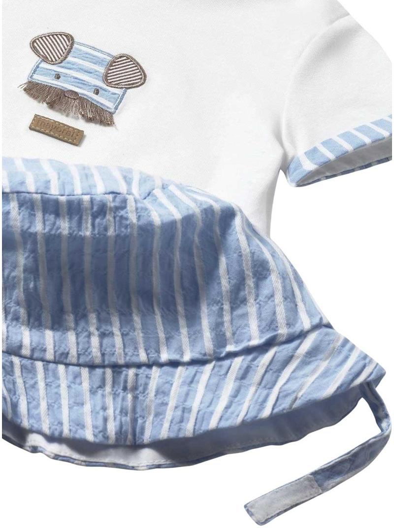 Conjunto Mayoral. Três peças. Camiseta, boné e shorts. Camiseta branca com detalhes em azul. Shorts e boné azul com estampa de listras.