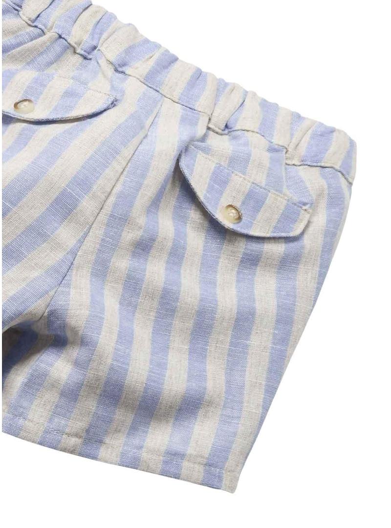 Conjunto Mayoral. Duas peças. Camisa em azul com gola redonda e fecho de botões. Shorts com estampa listrada e bolsos.