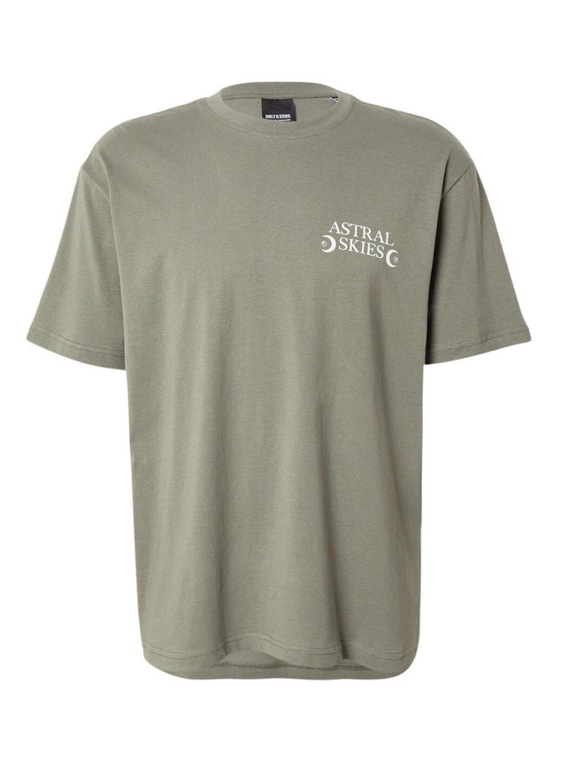 Camiseta Only and Sons. Modelo Keane. Cor verde. Gola redonda. Manga curta. Ajuste folgado. Ilustração no peito e nas costas.