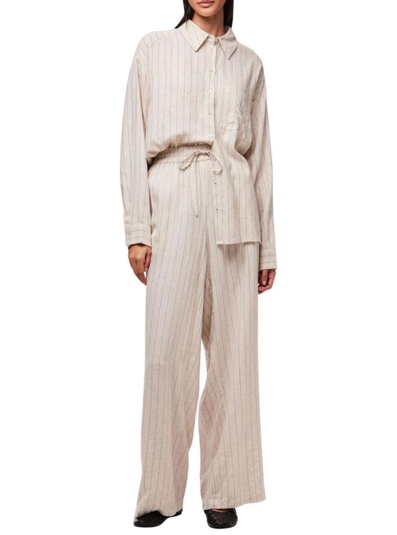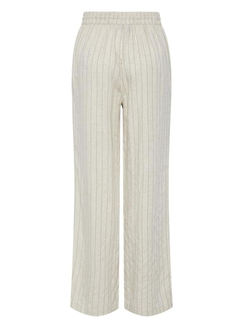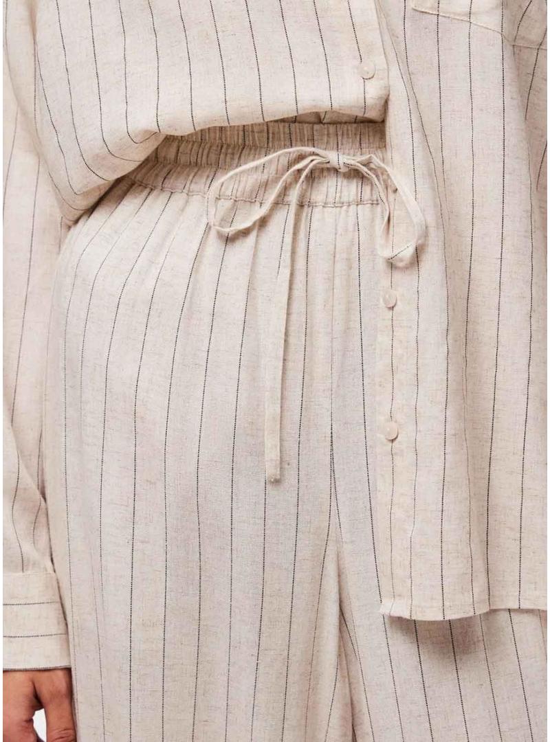 Calça Pieces. Modelo Pia Wide. Cor bege. Estampado com listra diplomática em preto. Corte largo. Bolsos laterais. Tecido fluido e leve com linho. Cintura elástica com cordão ajustável. Estilo básico.