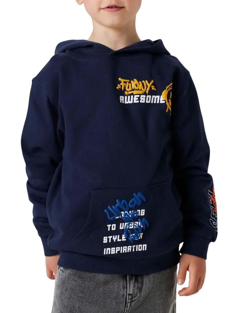 Moletom Name It. Modelo Lucian. Cor azul marinho. Com capuz. Extremidades caneladas. Bolso canguru. Ajuste regular. Mensagens estilo grafite estampadas em tons de azul e branco.