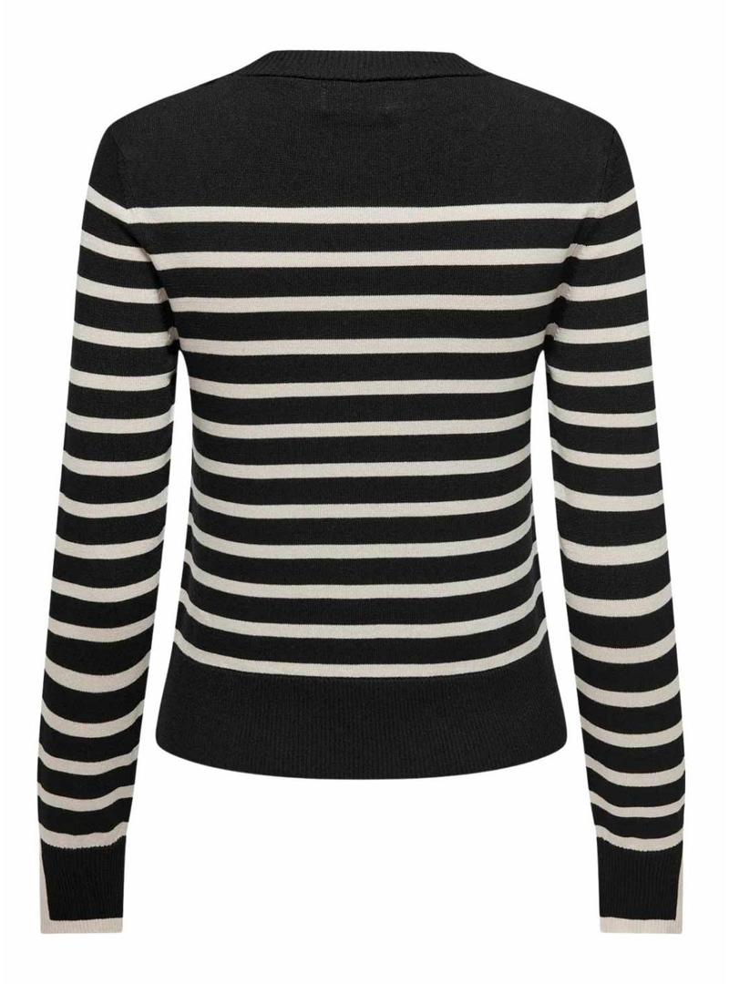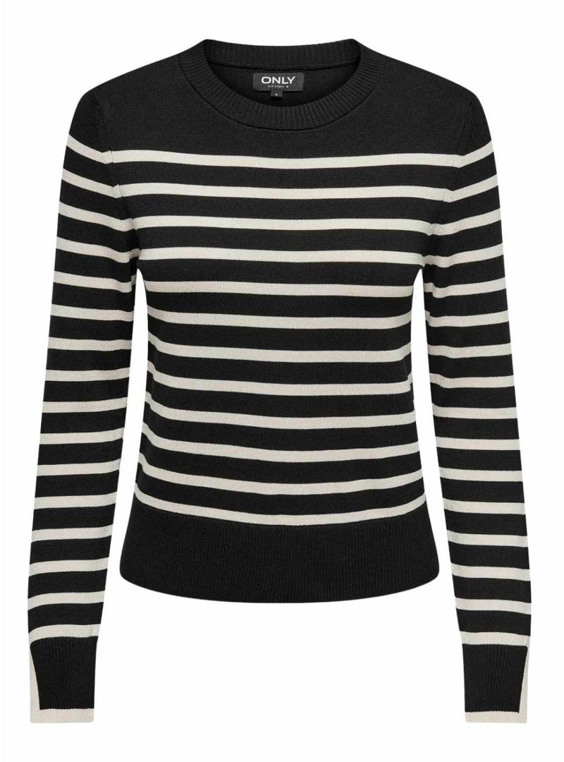 Camisola Apenas. Modelo Kalana. Cor preta. Gola redonda. Manga comprida. Estampa listrada. Acabamentos canelados. Punhos com abertura. Ombros ligeiramente caídos. Corte justo.