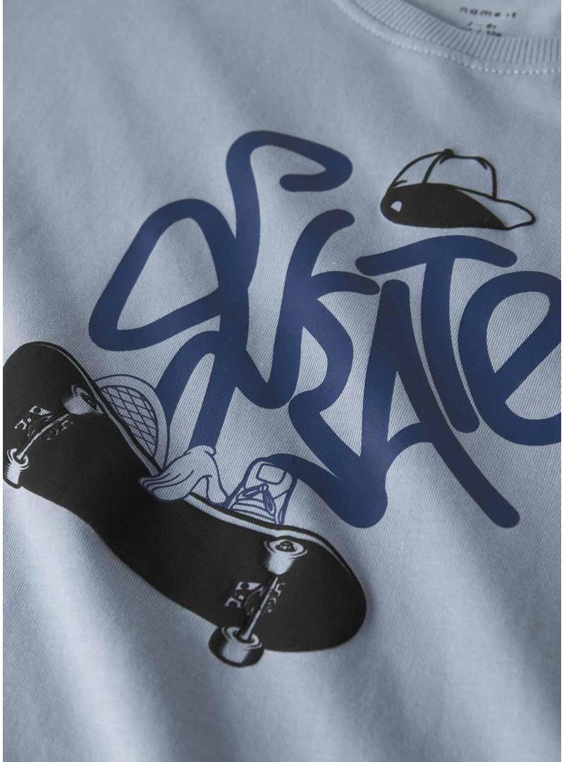 Camiseta Name It. Modelo Leroy. Cor azul. Gola redonda. Manga curta. Ajuste folgado. Mensagem e ilustração Skate na parte da frente.