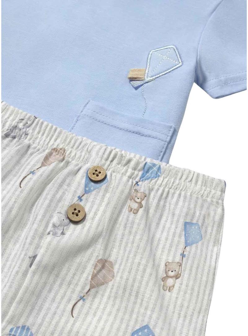 Conjunto de short estampado e camiseta. Cor azul céu. Para recém-nascido. Gola redonda. Botão de pressão no pescoço. Tecido macio de algodão elástico. Bordados na parte da frente da camiseta. Detalhes em ribana.