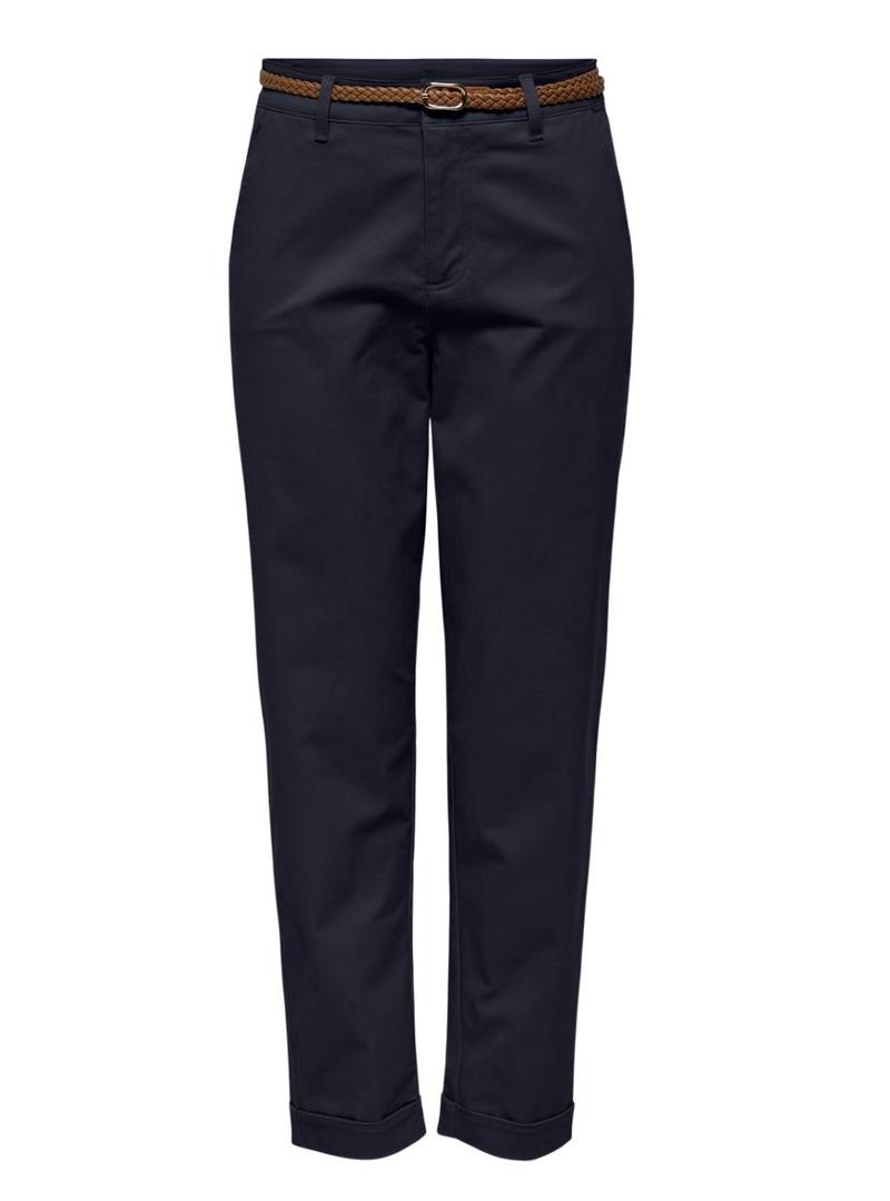 Calças Only. Modelo Sax. Cor azul marinho. Cintura média. Fecho de botão e zíper. Bolsos laterais. Cinto trançado. Corte cenoura. Bainha com dobra. Bolsos laterais. Bolsos traseiros com vivo.