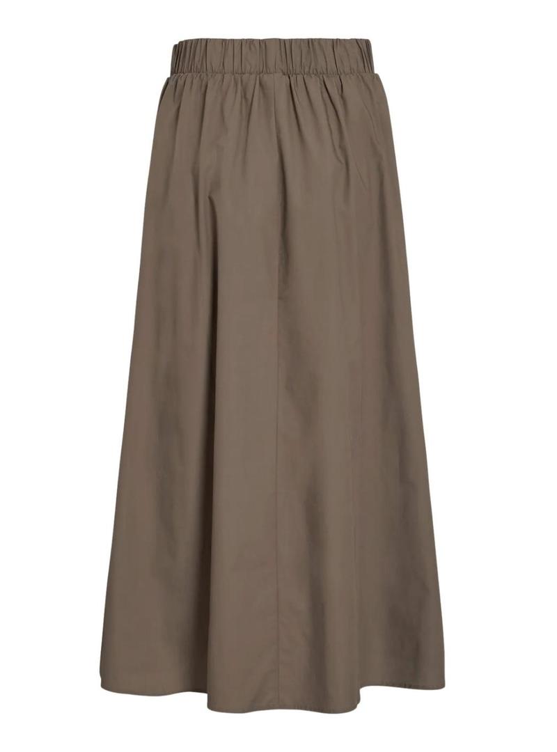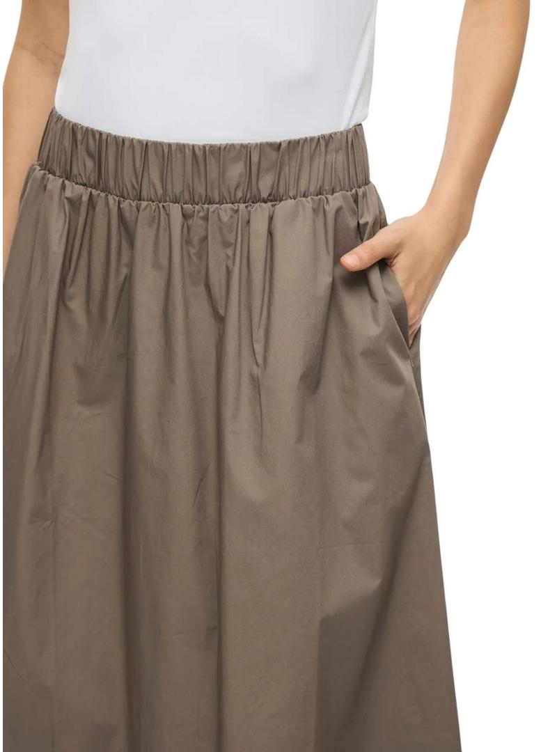 Saia Vila. Modelo Sophie. Cor caramelo. Cintura elástica. Comprimento midi. Bolsos laterais. Saia rodada.