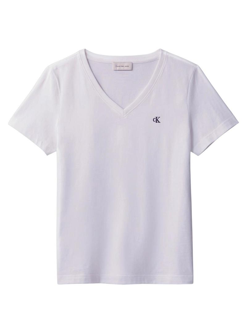Camiseta Calvin Klein Jeans. Modelo Monograma. Cor branca. Decote em V. Logotipo bordado no peito. Manga curta. Ajuste regular. Estilo minimalista.