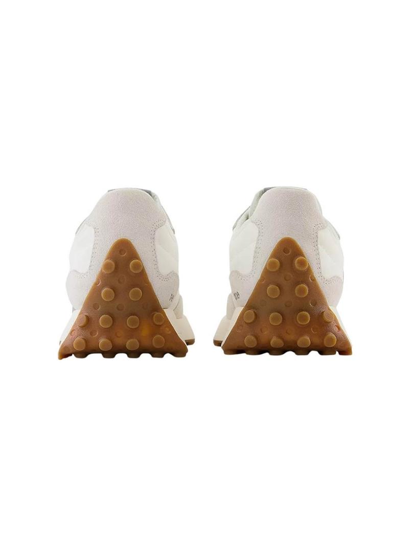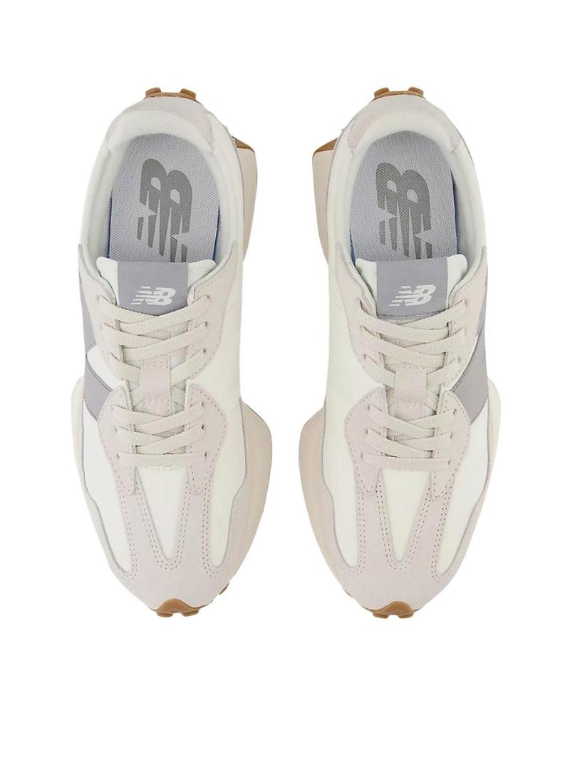 Sapatilhas New Balance. Modelo 327. Cor branca com logo em azul. Design clássico inspirado nos anos 70. Parte superior com detalhes retrô e língua de nylon. Marca linear 'New Balance' no lado interior. Sola com travas inspiradas no modelo de trilha 355. Reforço de borracha no calcanhar tirado dos modelos 320, 355 e Supercomp. Carril dividido. Estilo ousado e confortável para usar o dia todo. Peso: 322 g.