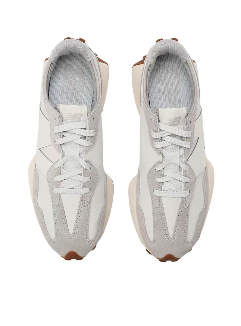 Sapatilhas New Balance. Modelo 327. Cor cinza. Parte superior em camurça e malha com design de presa sobredimensionada, inspirado nos modelos 320, 355 e Supercomp. Palminha de nylon de estilo retro. Marca 'N' em tamanho grande e detalhe 'New Balance' linear na lateral. Sola com travas inspiradas no trail running, com reforço de borracha no calcanhar. Entressola alargada. Trilho dividido. Peso: 295 g.