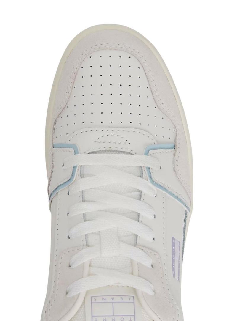 Sapatilhas Tommy Jeans. Modelo Retro Basket. Cor branca. Painéis em tons pastel lilás e azul. Logotipo lateral. Sola de borracha. Palmilha removível. Fecho com cordões. Detalhes de ventilação superior.