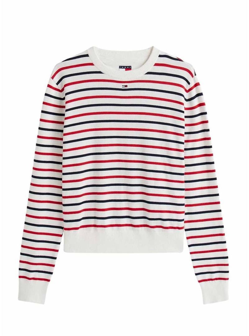 Jersey Tommy Jeans. Modelo Essential Crew. Cor branca. Estampado com listras verticais em vermelho e azul marinho. Gola redonda. Manga comprida. Ajuste regular. Pontas caneladas. Logotipo bordado no peito.