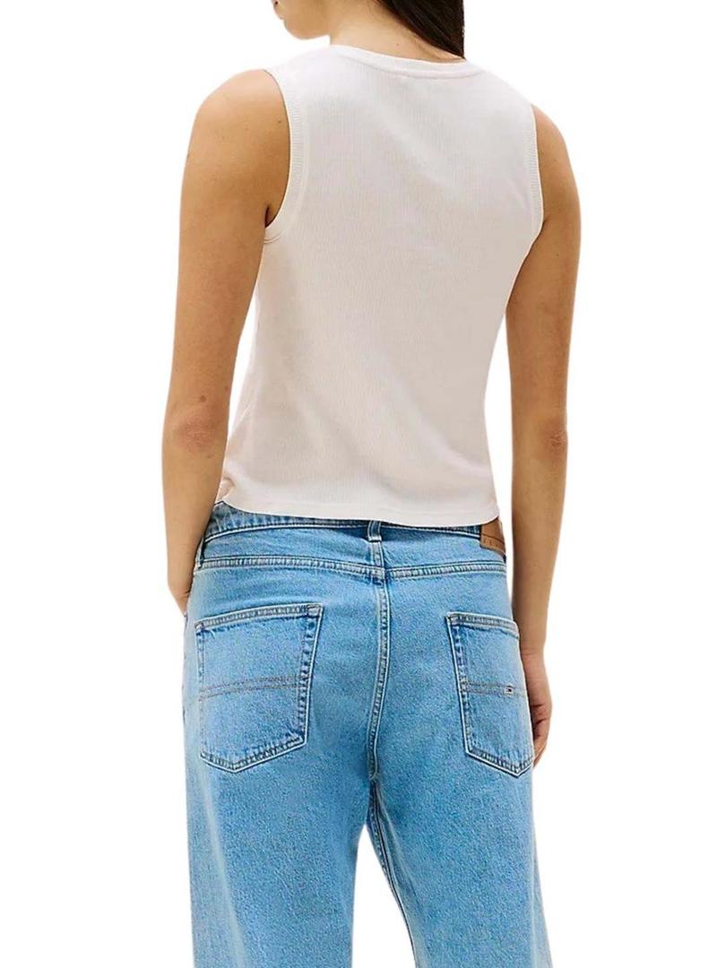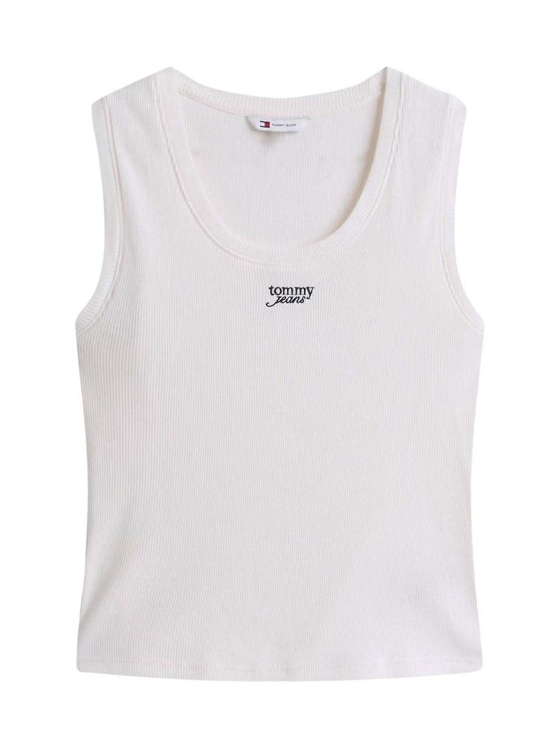 Camiseta Tommy Jeans. Modelo Script. Estilo regata. Decote redondo. Alças largas. Corte ajustado. Tecido canelado. Logo bordado no peito com fonte script. Cor branca.