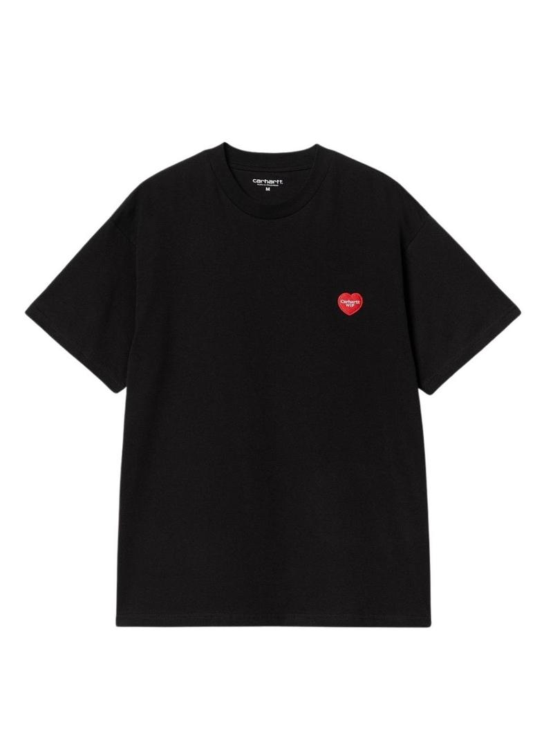 Camiseta Carhartt. Cor preta. Gola redonda. Ajuste folgado. Manga curta. Ilustração com marca estampada nas costas. Coração estampado no peito. Detalhes em vermelho e branco.