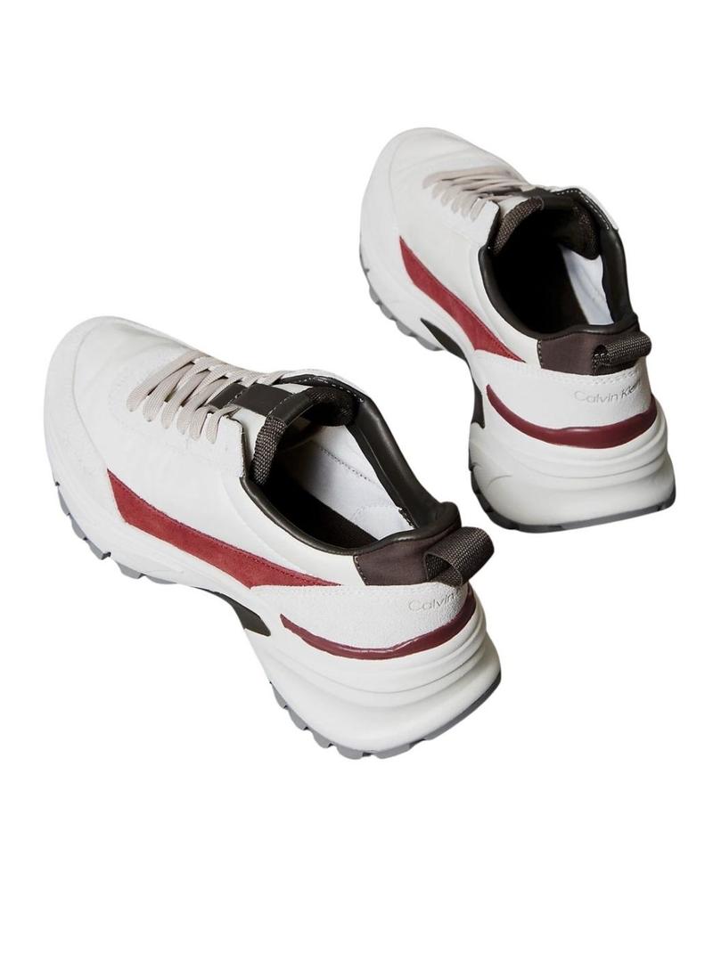 Sapatilhas Calvin Klein Jeans. Modelo Hike Runner. Cor branca. Fecho com cordões. Painéis em camurça cinza e vermelho. Sola de borracha volumosa. Logotipo estampado lateralmente em tom. Detalhes em tons de bordô.