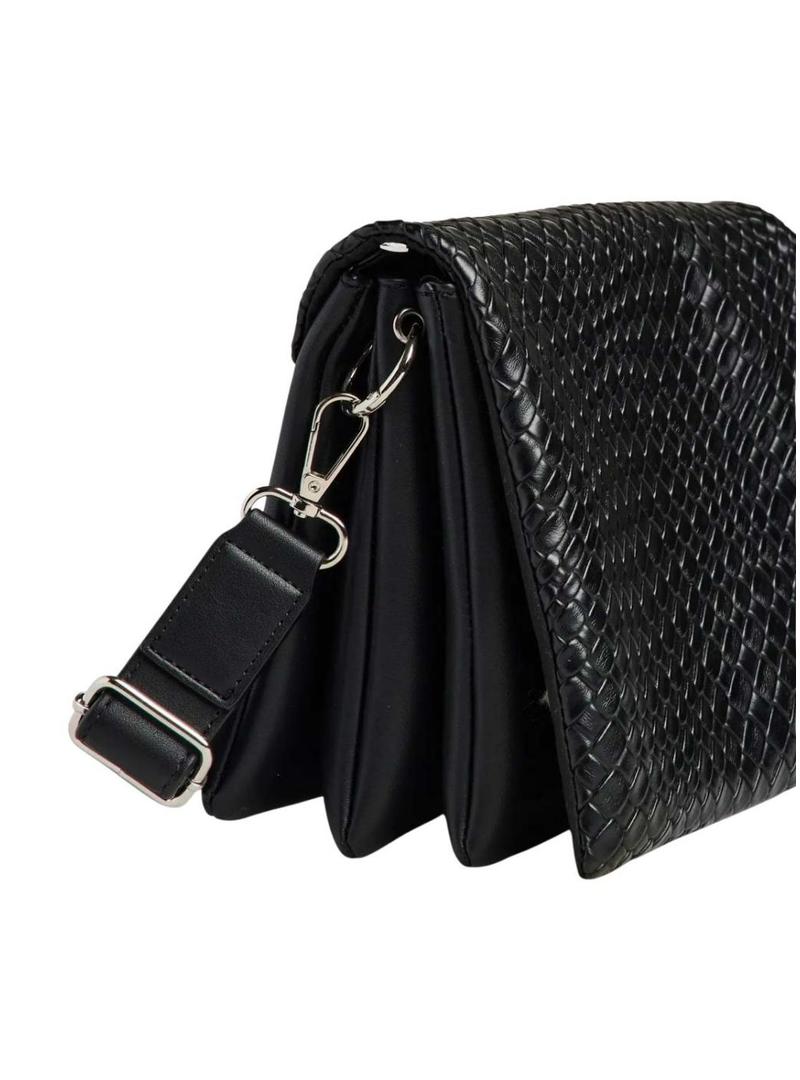 Bolsa Pieces. Modelo Jenni. Modelo Trançado. Cor preta. Textura trançada. Compartimento principal com fecho de correr. Bolso interior com fecho de correr. Alça ajustável removível. Medidas: altura 21cm, profundidade 14cm, largura 34cm.