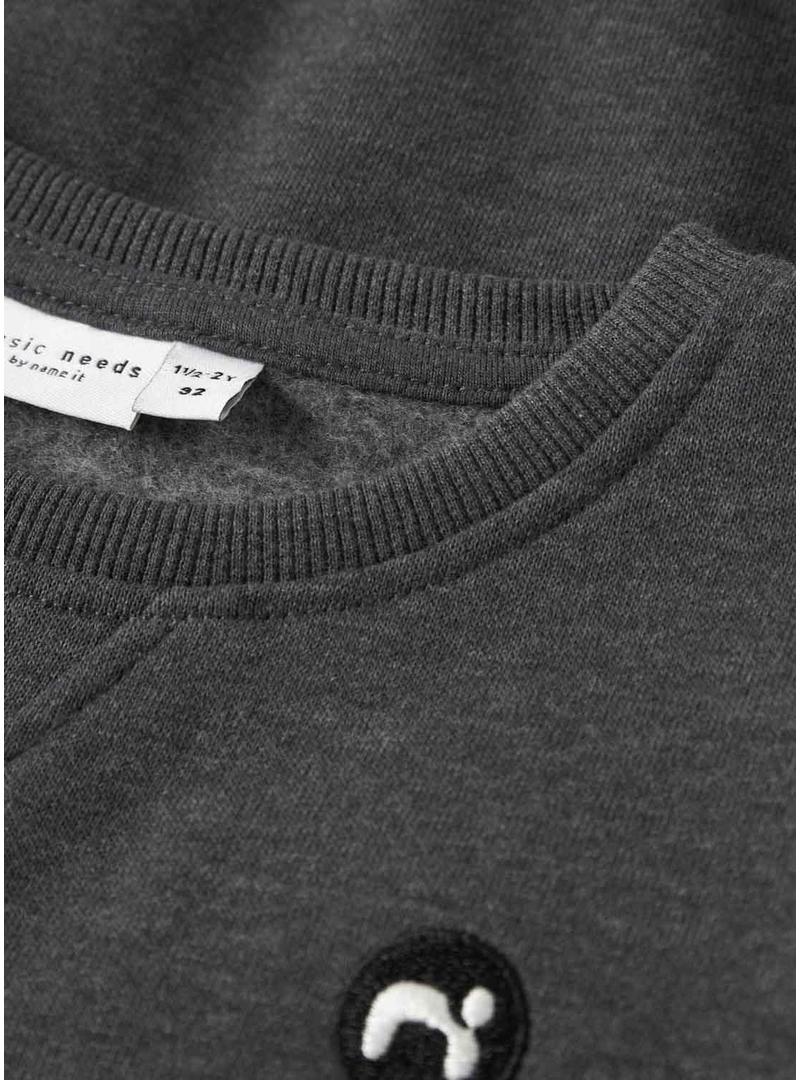 Camisola Name It. Modelo Vimo. Cor cinza. Gola redonda. Manga comprida. Emblema da marca bordado no peito. Corte regular. Acabamentos em canelado. Tamanhos de 2 a 7 anos.