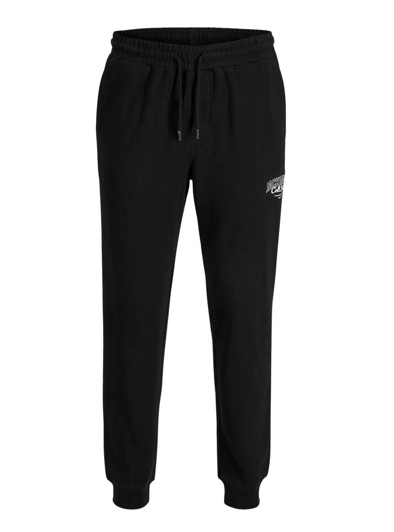 Calça esportiva Jack and Jones. Modelo Makoto. Cor preta. Cintura elástica. Dois bolsos laterais. Tornozelo ajustado com elásticos. Gráfico da marca na perna.