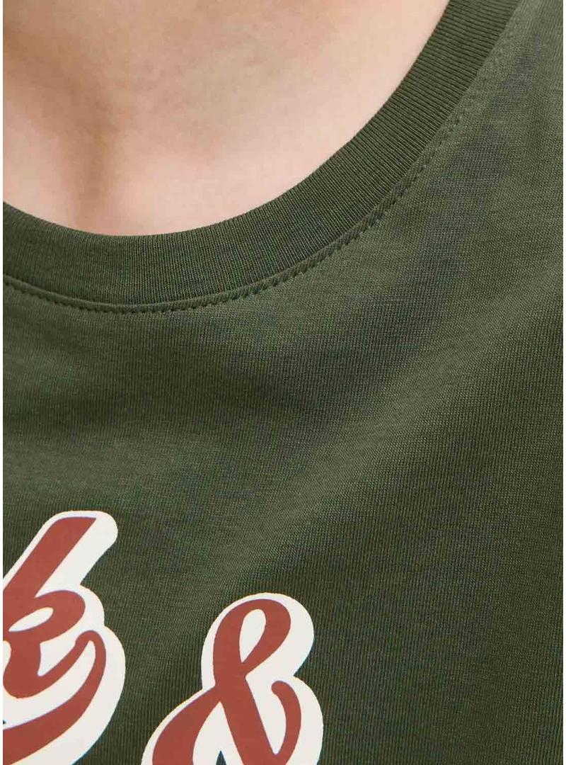 Camiseta Jack and Jones. Modelo Logo. Cor verde. Gola redonda. Manga curta. Corte regular. Gráfico estampado no peito.