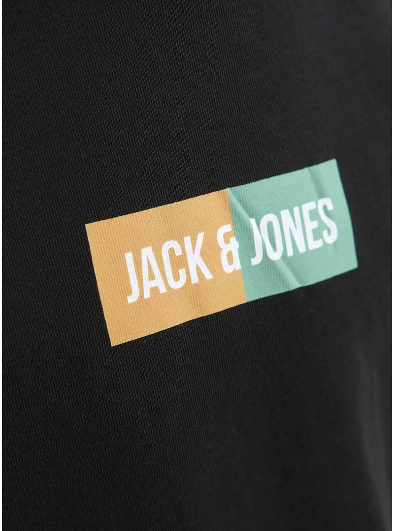 Camiseta Jack and Jones. Modelo Pan. Cor preta. Gola redonda. Manga curta. Corte regular. Gráfico da marca estampado no peito.