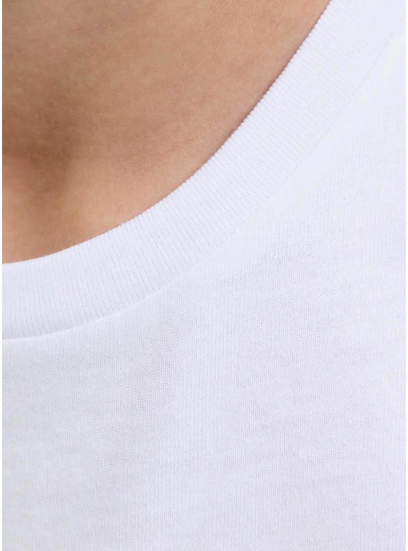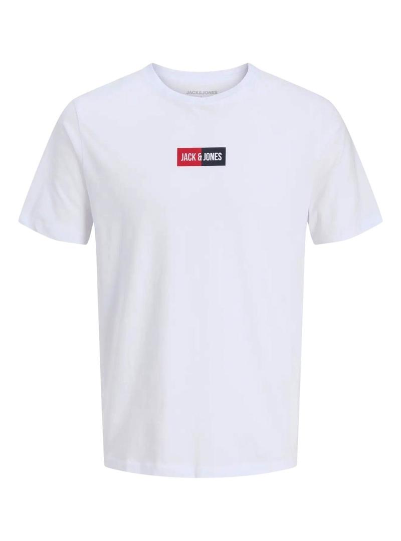 Camiseta Jack and Jones. Modelo Pan. Cor branca. Gola redonda. Manga curta. Corte regular. Gráfico da marca estampado no peito.