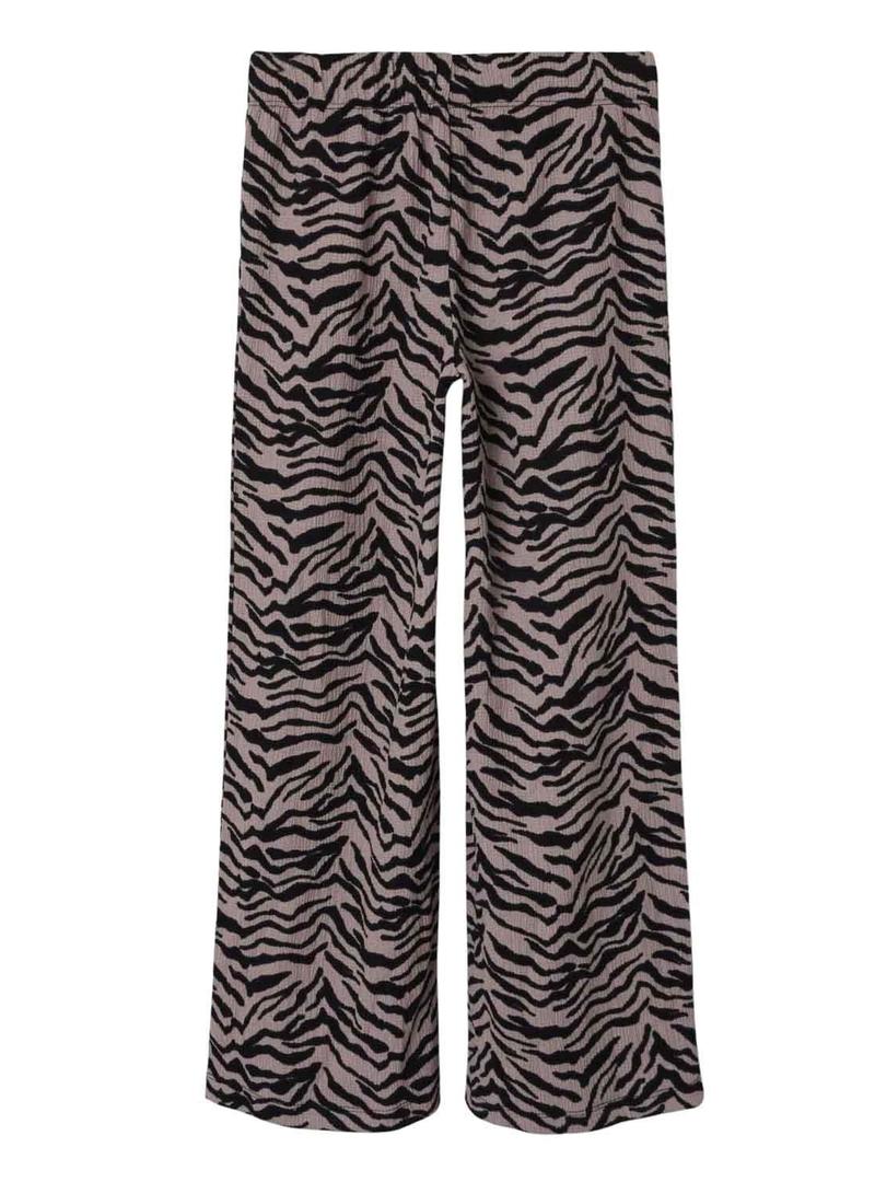 Calças Name It. Modelo Lotta. Cor lilás. Estampa animal print. Tecido leve. Cintura elástica. Bolsos laterais.