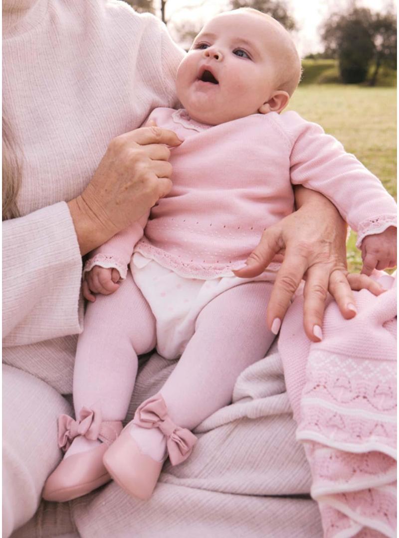 Conjunto Mayoral 3 peças. Para recém-nascida. Camisola rosa de manga comprida. Gola redonda com detalhes em contraste. Fecho com botões nas costas. Cueca com estampa de bolinhas. Cintura elástica. Collant rosa opaco.