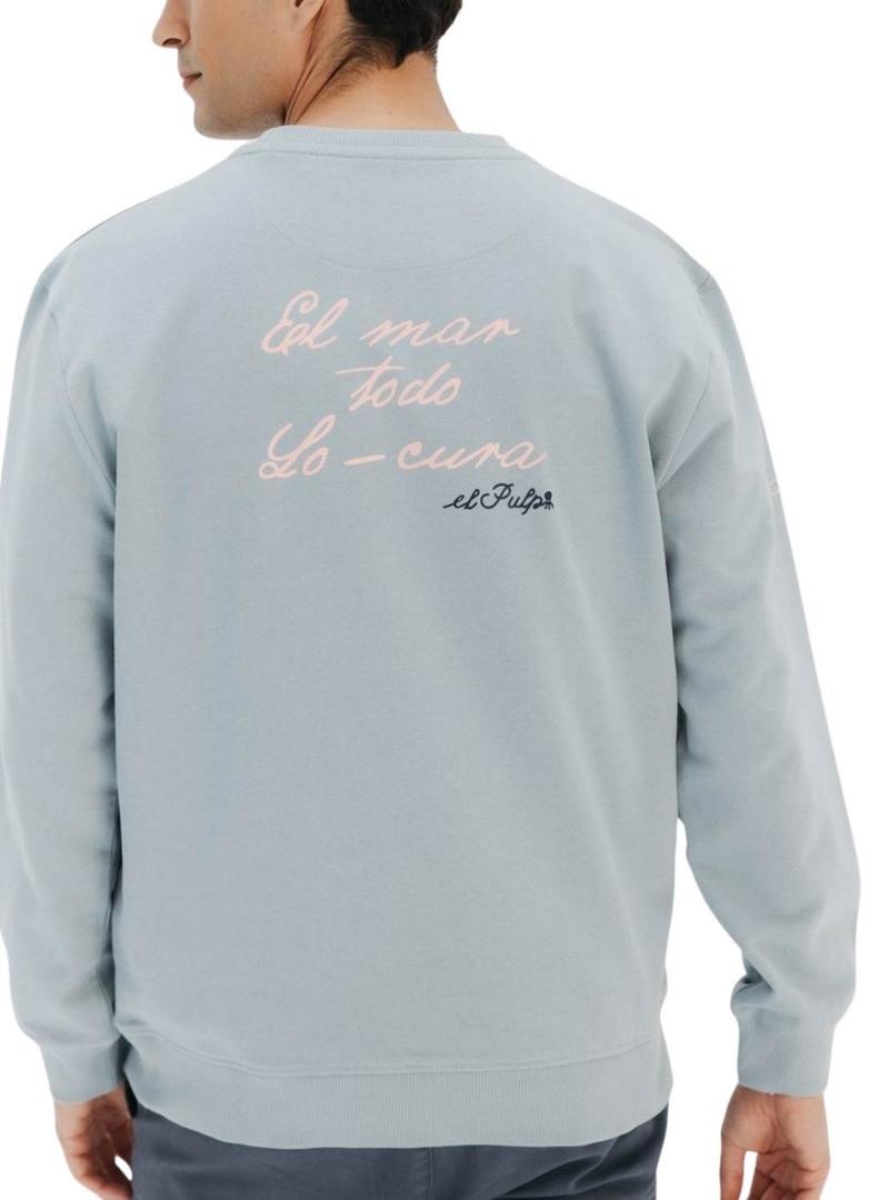 Moletom O Polvo. Modelo Palas. Cor azul claro. Capuz com cordões ajustáveis. Extremos canelados. Logotipo estampado no peito e nas costas. Detalhes em rosa e azul marinho. Ajuste regular. Mensagem O mar cura tudo nas costas.