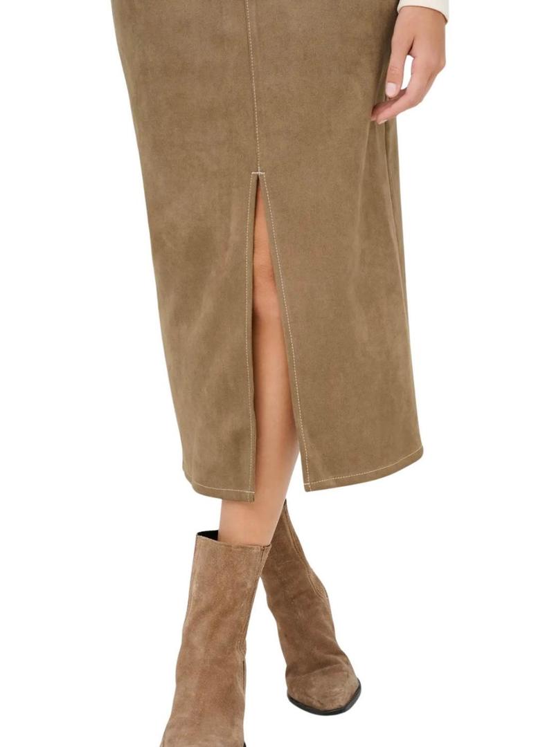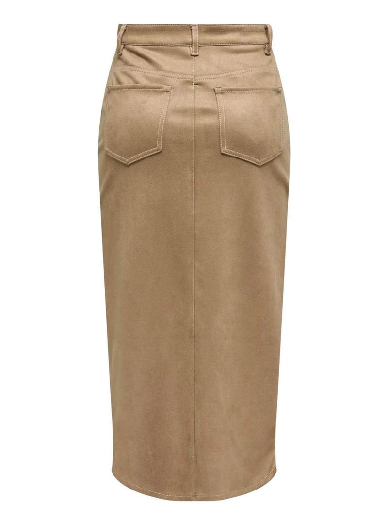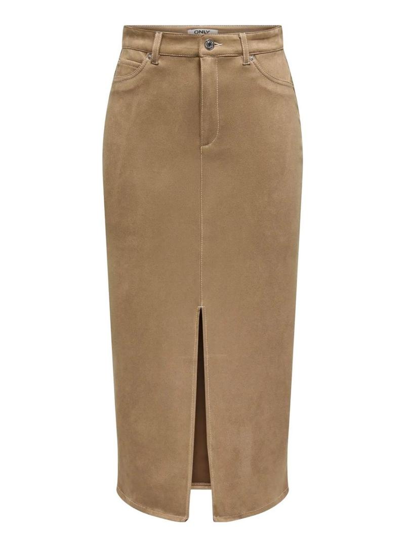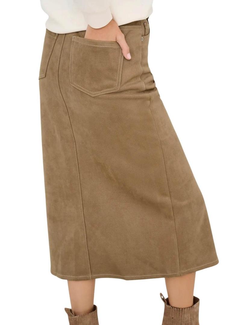Saia Only. Modelo Stina. Cor marrom. Ante sintético. Fecho com botão e zíper. Corte midi. Abertura frontal. Cinco bolsos. Tecido elástico. Toque suave.