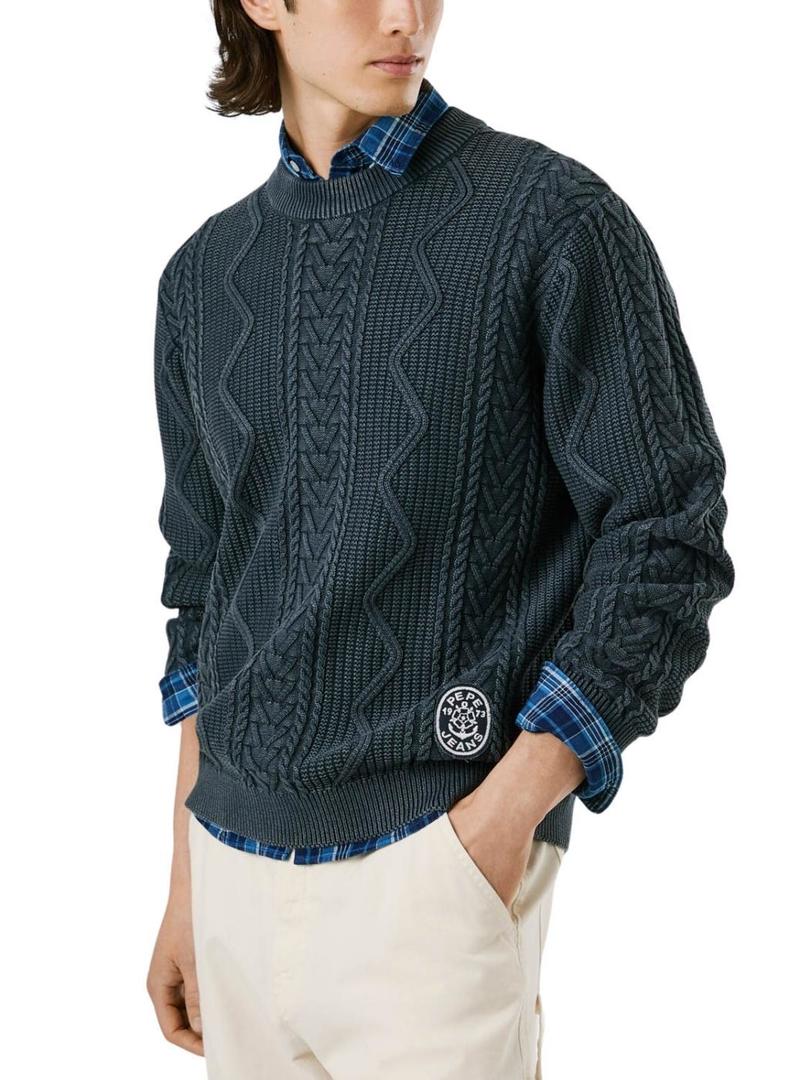 Camisola Pepe Jeans. Modelo Perry. Cor azul marinho. Tecido com detalhes trançados. Gola redonda. Extremidades caneladas. Ajuste regular. Patch da marca na barra em forma circular.