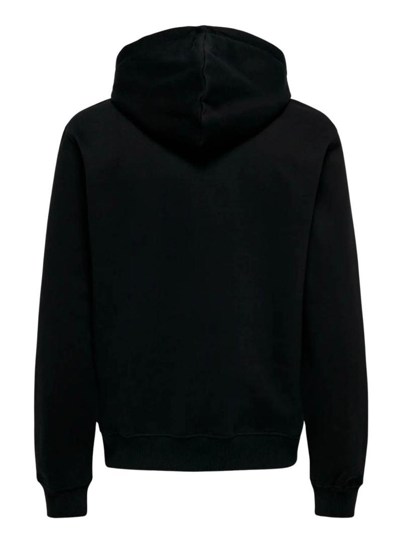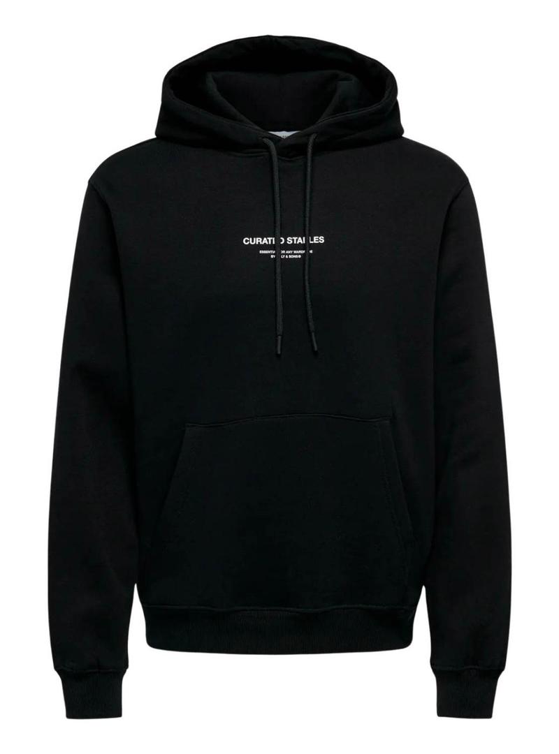 Moletom Only and Sons. Modelo Curated. Cor preta. Capuz com cordão ajustável. Bolso canguru. Pontas elásticas. Ajuste regular. Mensagem minimalista estampada no peito.