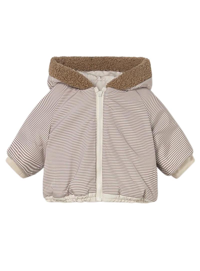 Casaco Mayoral. Cor bege. Manga comprida. Para recém-nascido. Capuz com detalhes de pelo. Fecho frontal com zíper. Exterior em tecido acolchoado. Interior com estampa de listras.