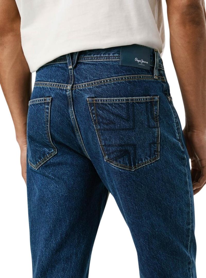 Calça jeans Pepe Jeans. Modelo Byron. Denim escuro. Corte reto. Ajuste regular. Cinco bolsos. Patch da marca na cintura.