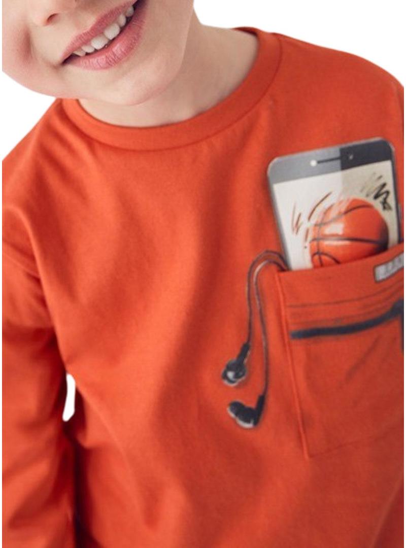 Camiseta Mayoral. Cor laranja. Manga comprida. Gola redonda. Bolso com estampa no peito.