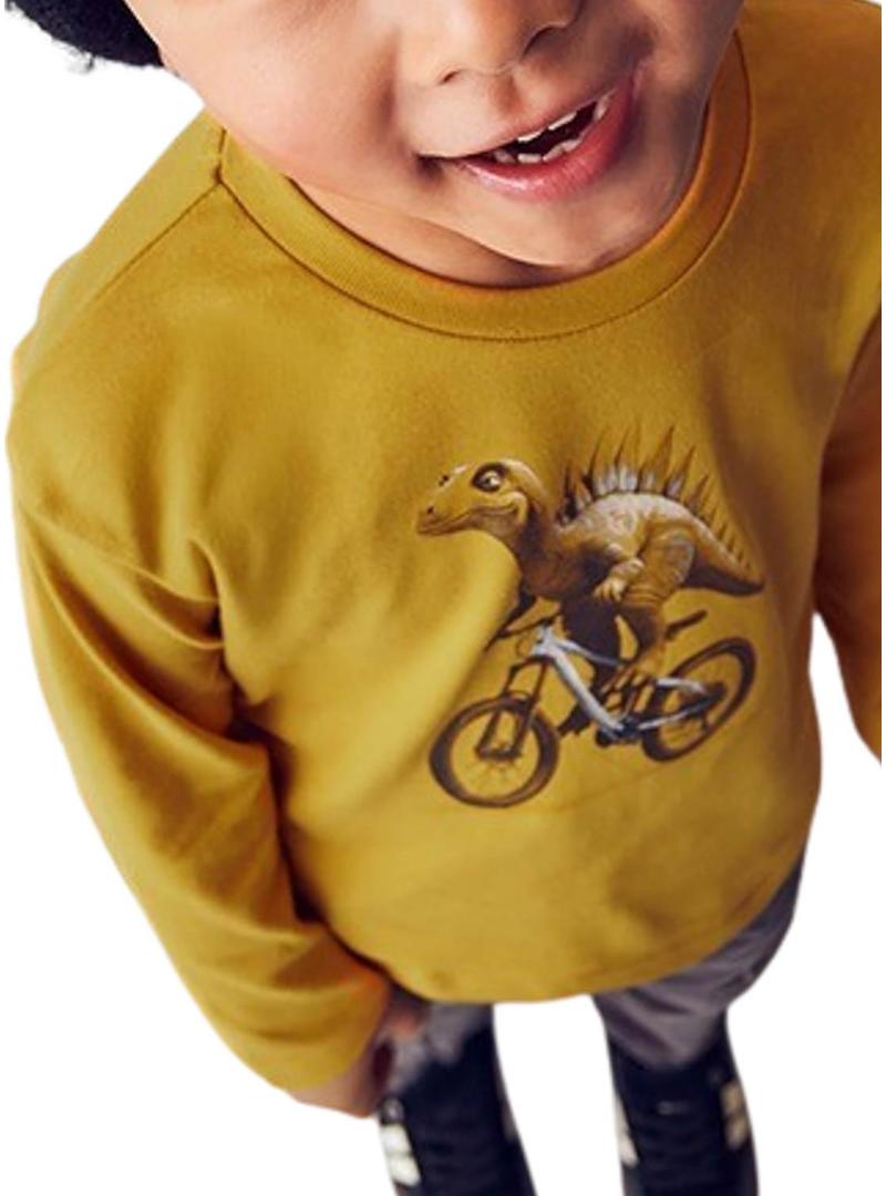 Camiseta Mayoral. Cor mostarda. Gola redonda. Manga comprida. Estampa de dinossauro em bicicleta na frente.
