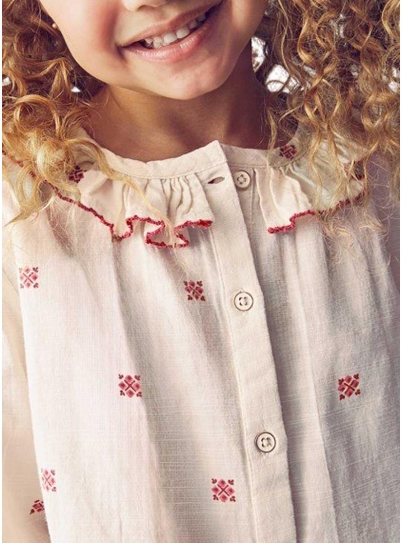 Blusa Mayoral. Manga comprida. Gola redonda com babado. Fecho com botões na parte da frente. Estampada.
