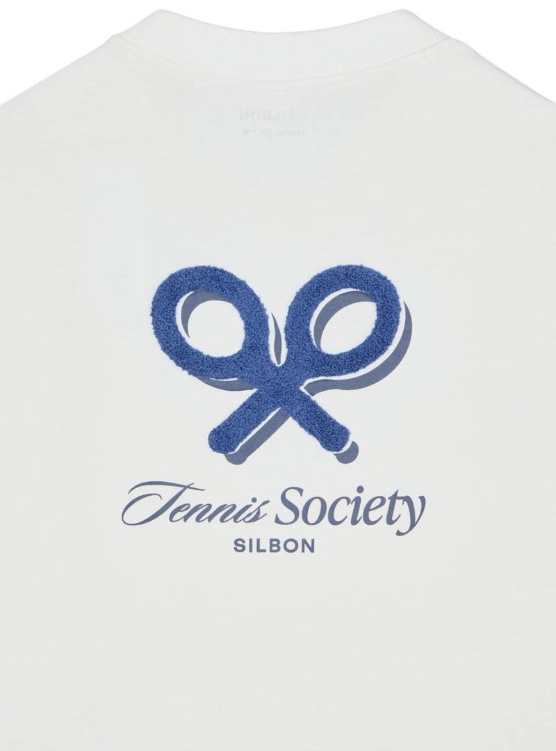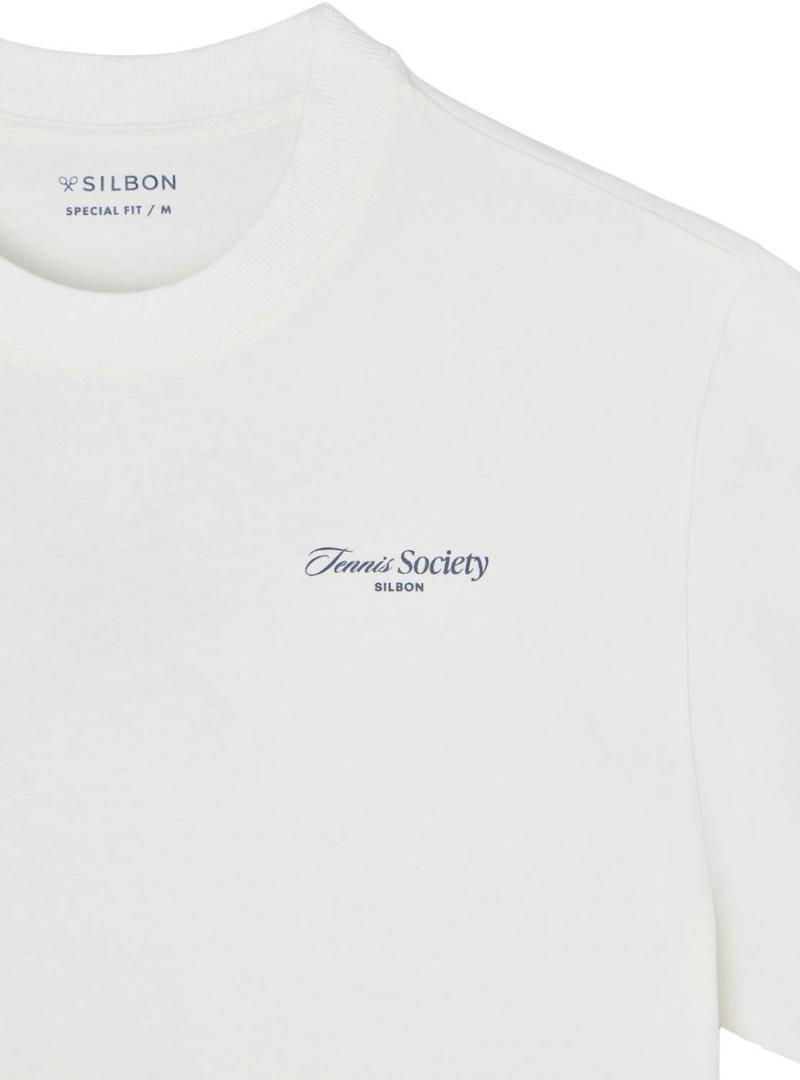 Camiseta Silbon. Modelo Tennis Society. Cor branca. Marca estampada no peito. Logo nas costas. Detalhes em azul. Manga curta. Gola redonda. Ajuste folgado.