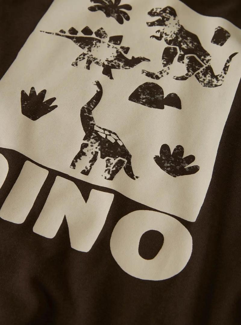 Camiseta Name It. Cor marrom. Gola redonda. Manga comprida. Corte regular. Estampa de dinossauros na frente e nas costas.