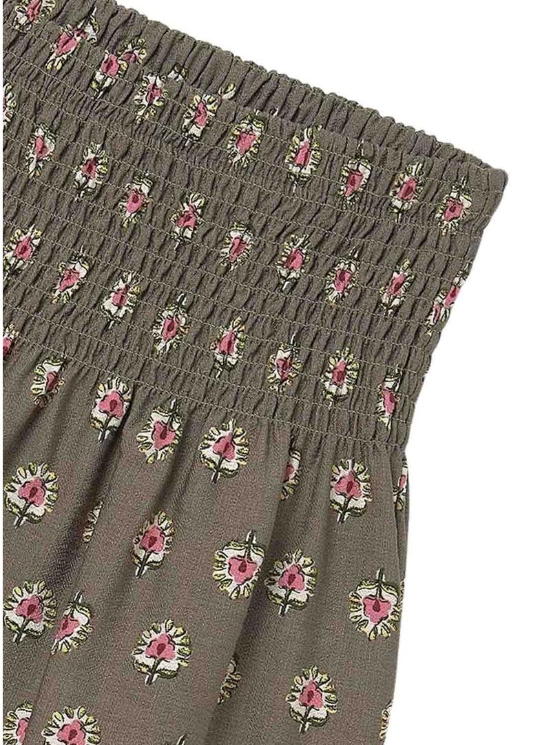 Saia Mayoral. Cor verde. Estampa floral. Cintura elástica. Detalhes de favo de mel. Formato curto.