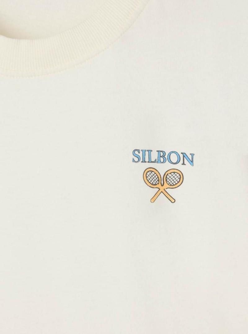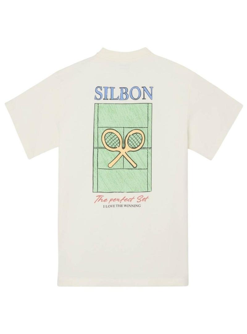 Camisa Silbon. Modelo Perfect Set. Cor bege. Ajuste largo. Gola redonda. Manga curta. Logotipo com raquete estampado no peito. Ilustração de tênis estampada nas costas.