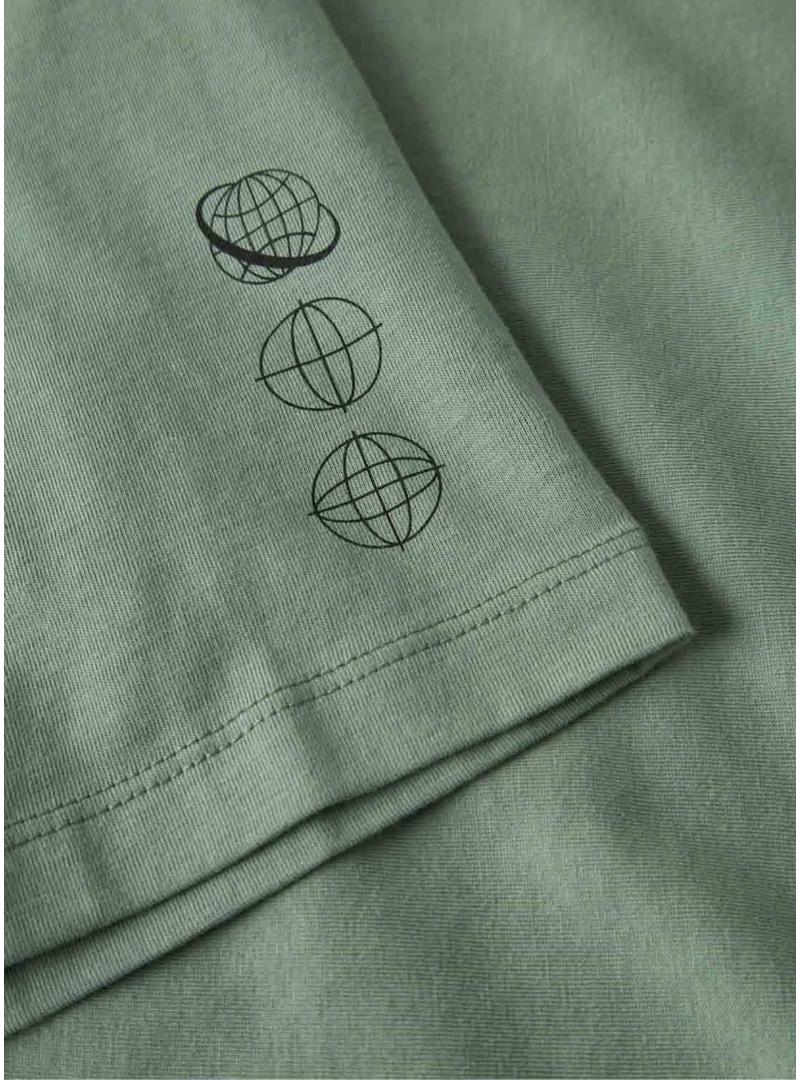 Camiseta Name It. Cor verde. Gola redonda. Manga curta. Ombros caídos. Pequena estampa na parte da frente. Etiqueta em uma manga. Corte regular.
