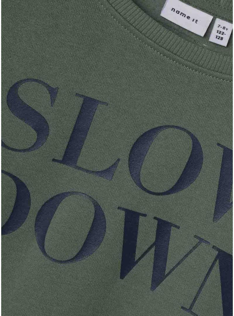 Moletom Name It. Cor verde. Formato regular. Gola redonda. Manga comprida. Estampado no peito. Bainha canelada. Etiqueta decorativa nas costas.