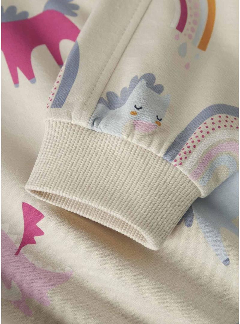 Moletom Name It. Cor bege. Estampa de unicórnios. Gola redonda. Mangas compridas. Corte regular. Acabamentos canelados. Ombros caídos. Forrado com tecido quente.